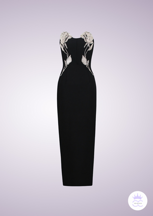 Everly Dress, a classic black tube dress adorned with rhinestone-embroidered roses.